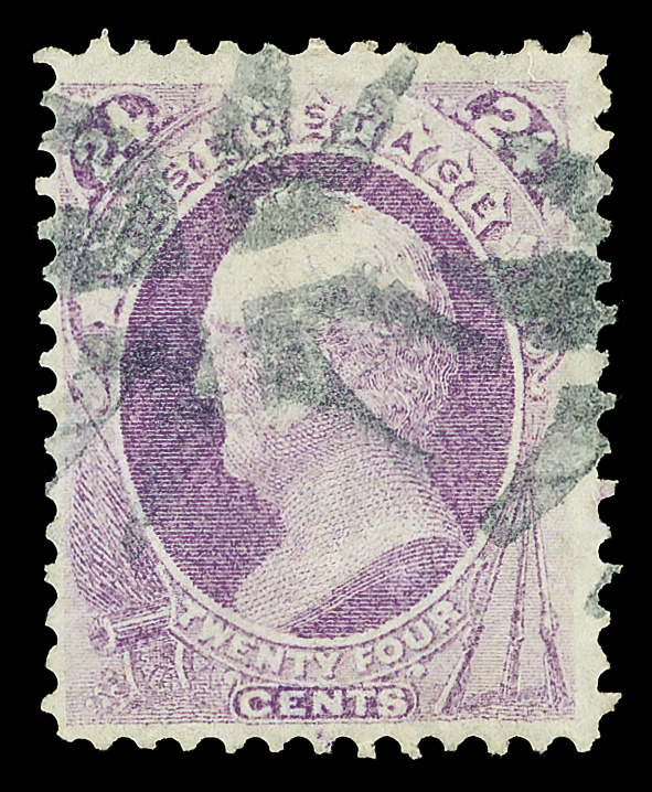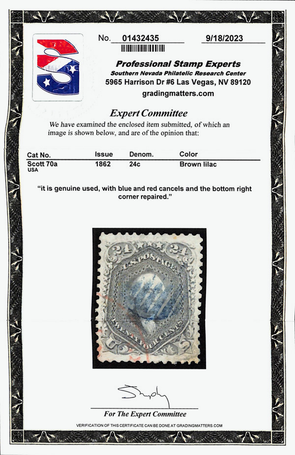 8012 O 70a image1862, 24¢ brown lilac (Scott 70a), beautifully centered with clean color and black and red cancels; bottom right corner repaired, otherwise Extremely Fine, with 2023 P.S.E. certificate.