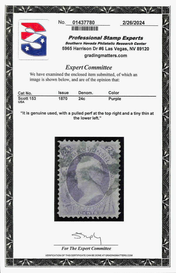 8034 O 153 image1870, 24¢ purple, without grill, N.B.N.C. printing (Scott 153), single; Pulled perforation top right and tiny thin lower left, Fine to Very Fine, with 2024 P.S.E. certificate.