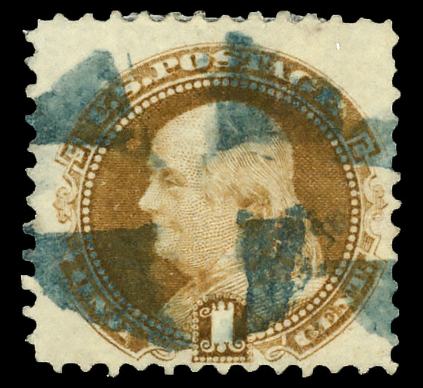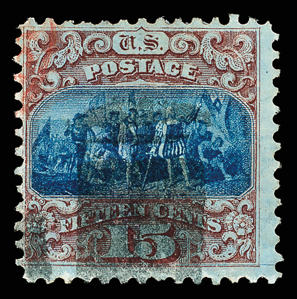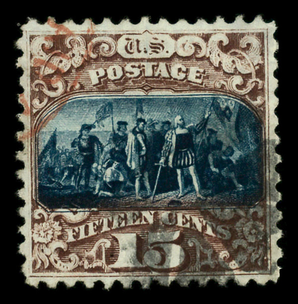 8030 O 118 image1869, 15¢ brown & blue, type I (Scott 118), sound with strong colors near-perfectly registered, black cork and partial red cancels; blue plate wash adds to the visual appeal, Fine to Very Fine.