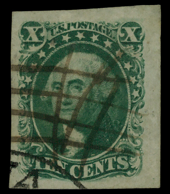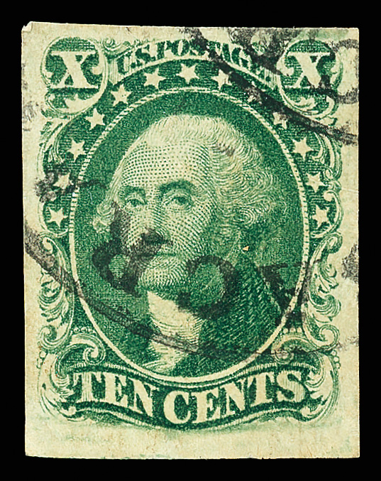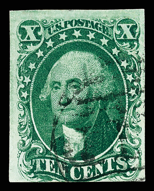 8004 O 13 image1855, 10¢ green, type I (Scott 13), fresh with intense color and unobtrusive cancel; three margins clear to full, bottom just grazing, Fine to Very Fine.
