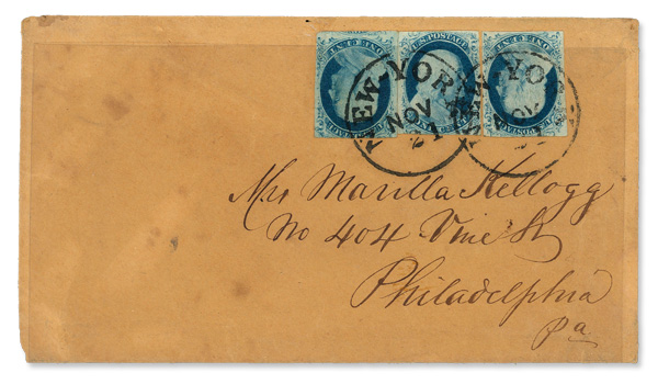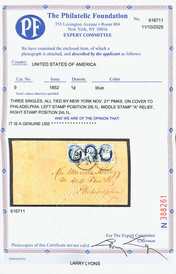 8001 cover 9 image1852, 1¢ blue, type IV (Scott 9), 3 singles, all tied by 'NEW YORK NOV 21' postmarks on cover to Phildelphia. Left stamp position 29L1L, middle stamp 'A' relief, right stamp position 24L1L., Very Fine, with 2025 P.F. certificate.