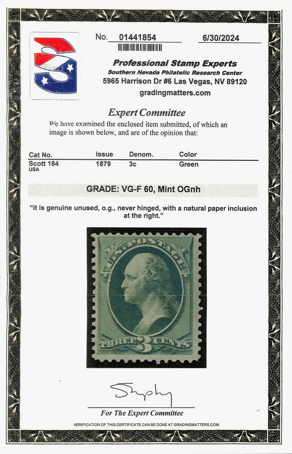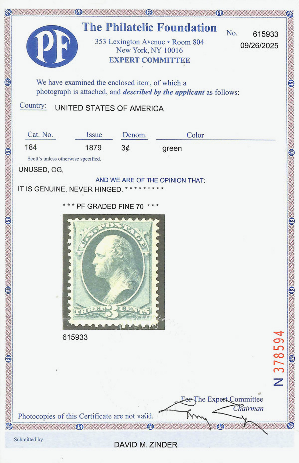 8040 nh 184 image1879, 3¢ green, A.B.N.C. printing (Scott 184), o.g., never hinged, Fine, with 2025 P.F. certificate graded F 70 & 2024 P.S.E. certificate graded VG-F 60.