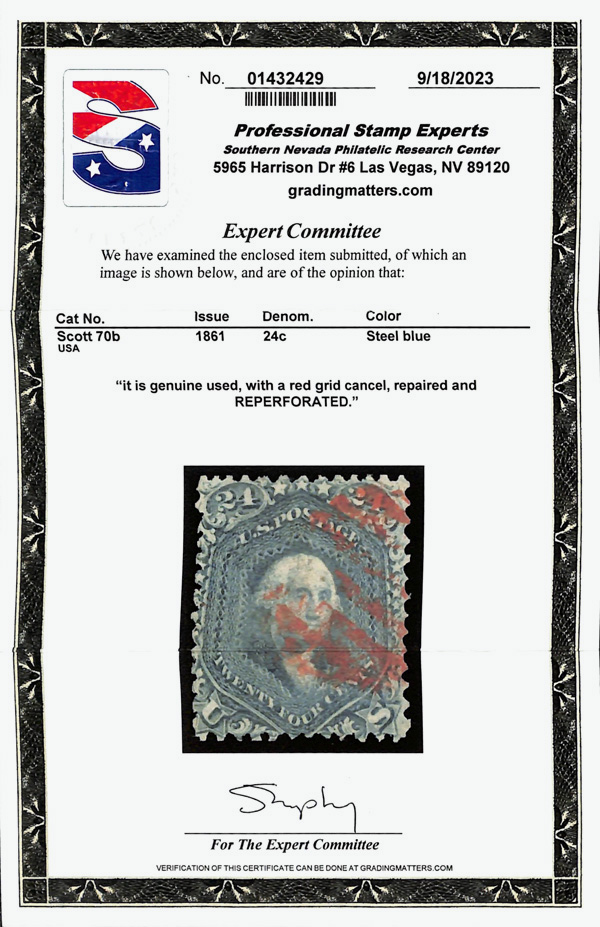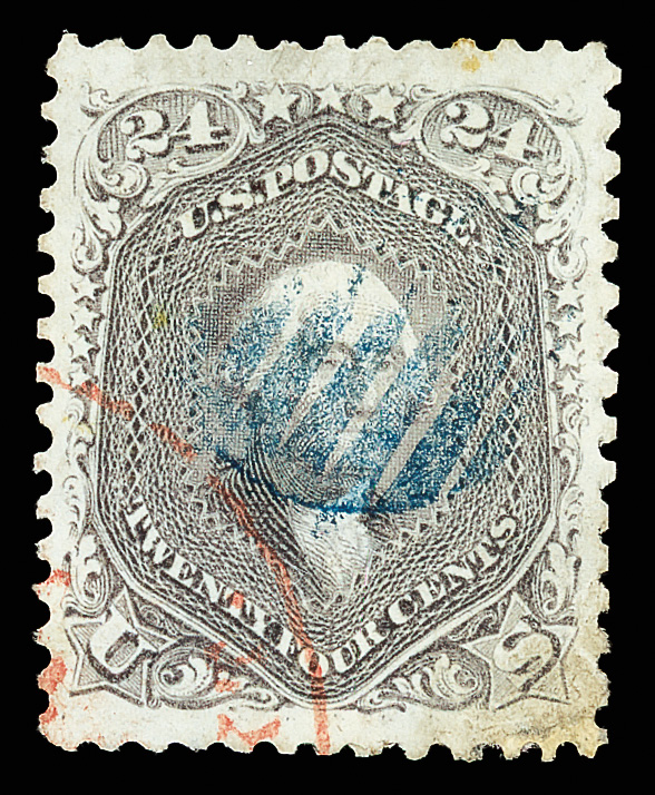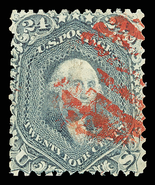 8013 O 70b image1861, 24¢ steel blue (Scott 70b), fresh-faced with robust color and a red grid cancel; repaired and reperforated, Fine appearance.