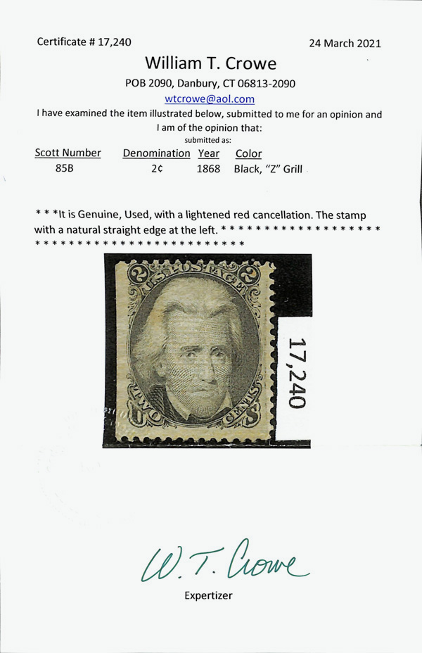 8019 O 85B image1867, 2¢ black, Z. grill (Scott 85B), crisply printed and looking every inch unused, but with lightened red cancel; natural straight edge at left, Fine+, with 2021 Crowe certificate.