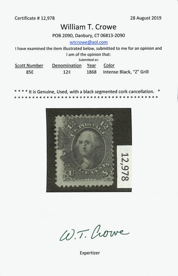 8020 O 85E image1867, 12¢ intense black, Z. grill (Scott 85E), sound with deep color on fresh paper, grill faintly face-visible, with unobtrusive circle-of-wedges cancel, Fine, with 2019 Crowe certificate.