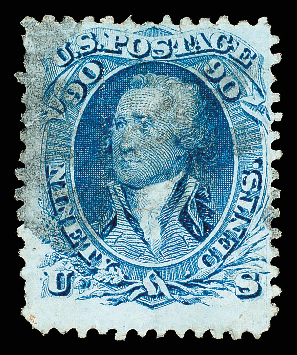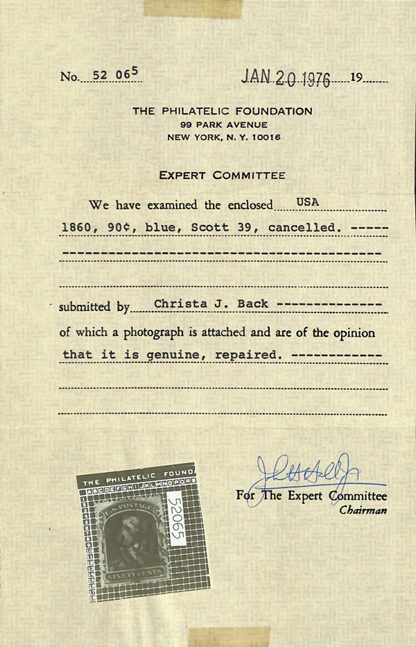 8010 O 39 image1860, 90¢ blue (Scott 39), face-fresh with rich color and enticing centering; black circular grid cancel; repaired (as often), Very Fine appearance, with 1976 P.F. certificate.