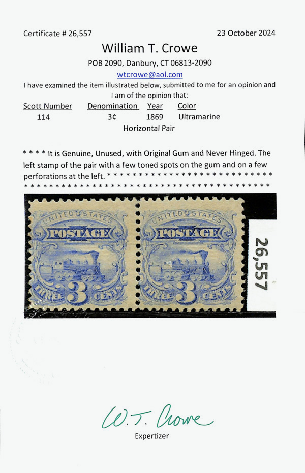 8027 nh 114 image1869, 3¢ ultramarine (Scott 114), o.g., never hinged, face-fresh with robust color on lily-white paper; few toned spots on gum, Fine, with 2024 Crowe certificate for pair, this position 1.