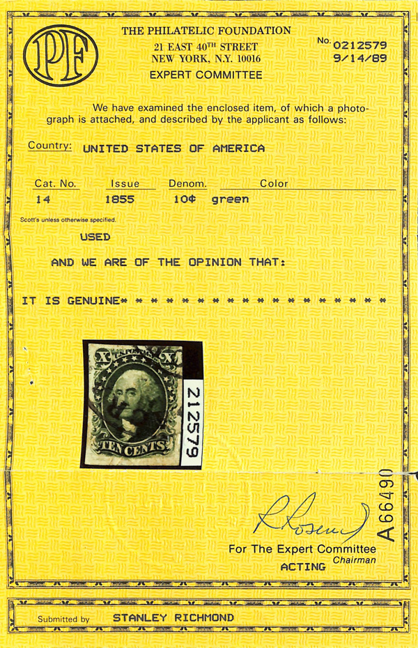 8005 O 14 image1855, 10¢ green, type II (Scott 14), sound with rich color and clean impression, full to oversized margins; postmarks (Sacramento?) unobtrusive, Very Fine to Extremely Fine, with 1989 P.F. certificate.
