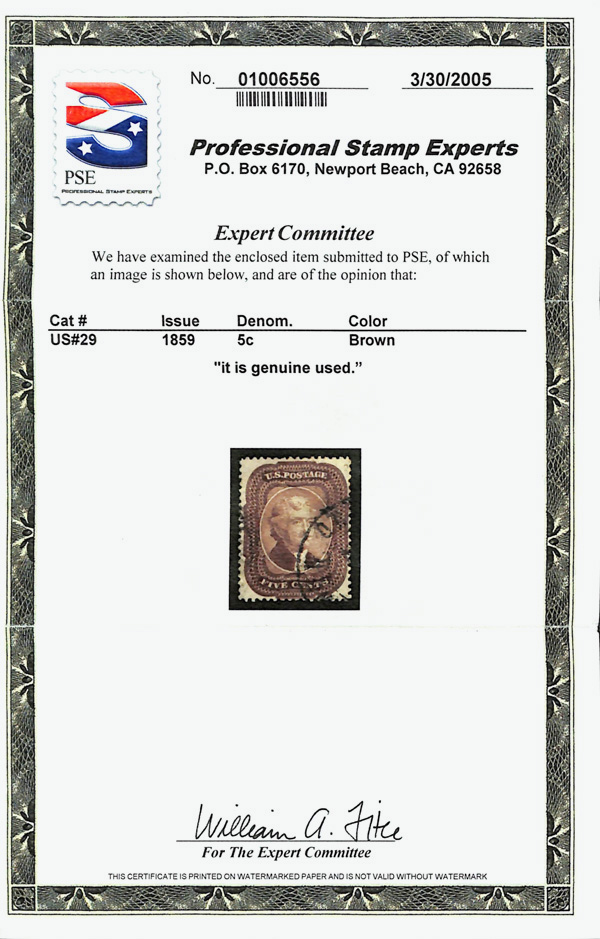 8009 O 29 image1859, 5¢ brown, type I (Scott 29), Post Office fresh with solid color and attractive centering; New Orleans town postmark, Very Fine, with 2005 P.S.E. certificate.