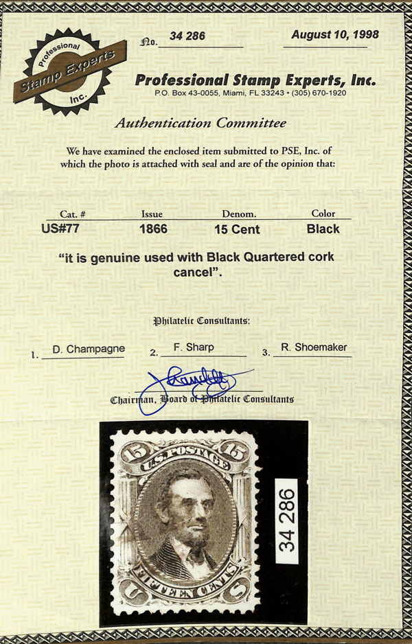 8017 O 77 image1866, 15¢ black (Scott 77), fresh and sound with crisp impression and superior centering; strong color and light quartered cork cancel, Very Fine to Extremely Fine, with 1998 P.S.E. certificate.