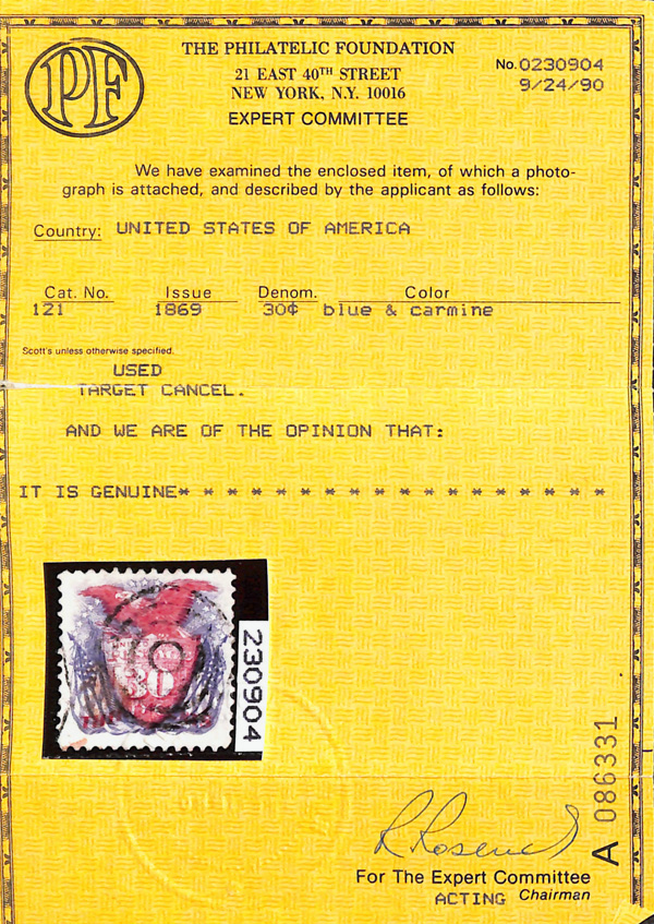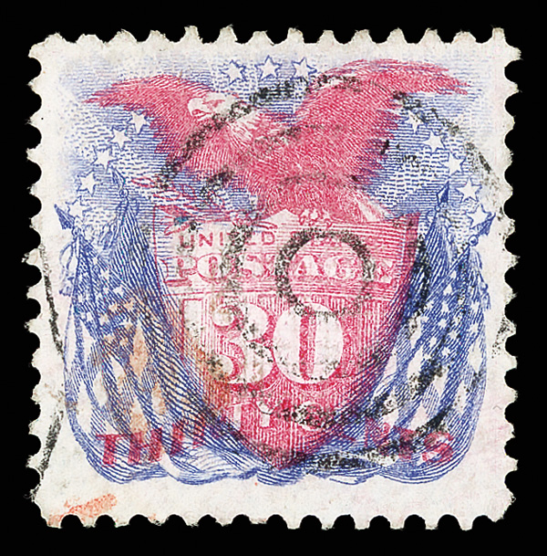 8033 O 121 image1869, 30¢ ultramarine & carmine (Scott 121), attractive stamp with pastel colors on like-new paper, sound with target cancel, Very Fine to Extremely Fine, with 1990 P.F. certificate.