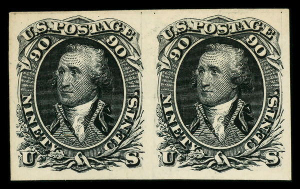 8025 P 111TC4a image1861-66 (1875 Re-issue), 90¢ black, "Atlanta" trial color plate proof on card (Scott 111TC4a), pair, o.g., never hinged, Extremely Fine.