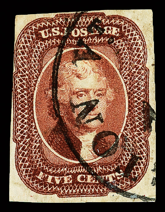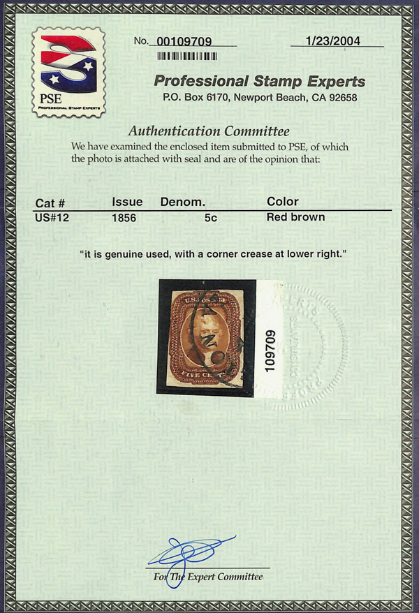 8003 O 12 image1856, 5¢ red brown (Scott 12), full margins at right and bottom, clear to just touching other sides, gorgeous color and a proof-quality impression on crisp white paper, well struck circular datestamp; tiny corner crease at bottom right well clear of the design, still Very Fine and attractive, with 2004 P.S.E. certificate.