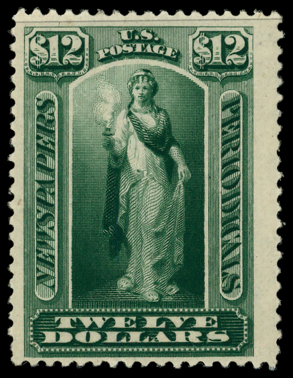 8390 og PR75 imageNewspaper, 1879, $12 yellow green, A.B.N.C. printing (Scott PR75), o.g., lightly hinged, tiny thin spots, otherwise Fine to Very Fine.
