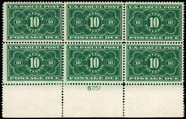 8400 ogbl JQ4 imageParcel Post Postage Due, 1913, 10¢ dark green (Scott JQ4), bottom margin plate number 6251 block of 6, this is the undisputed key stamp to this plate block set and is often difficult to find in any condition, glazed o.g. with a few hinge remants placed to strengthen perforations; slight toning on back, overall Fine to Very Fine.