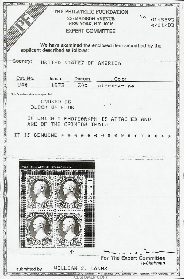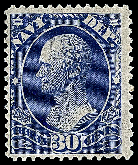 8384 og O44 imageNavy Dept., 1873, 30¢ ultramarine (Scott O44), o.g., hinged, Fine to Very Fine, with photocopy of 1983 P.F. certificate for block of which this is the LR stamp.