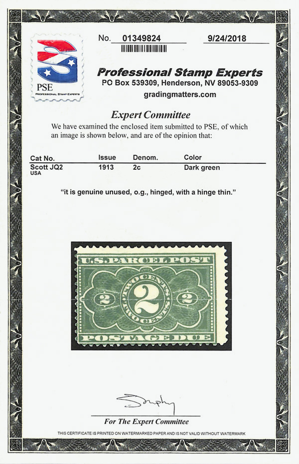 8398 og JQ2 imageParcel Post Postage Due, 1913, 2¢ dark green (Scott JQ2), single, o.g., hinged; With hinge thin., Very Good, with 2018 P.S.E. certificate.