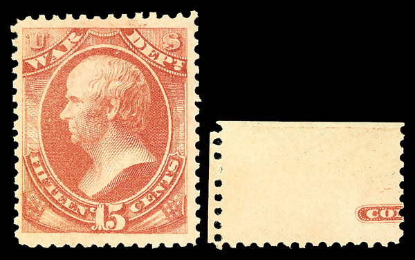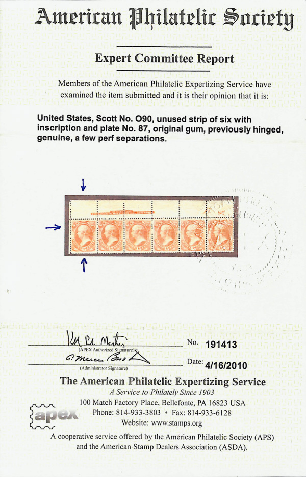 8386 og O90 imageWar Dept., 1873, 15¢ rose (Scott O90), single, This is the left stamp from a strip of six., o.g., hinged, Very Fine, with 2010 A.P.E.X. certificate.