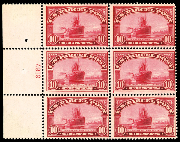 8394 nhbl Q6 imageParcel Post, 1913, 10¢ Steamship and Mail Tender (Scott Q6), left margin plate number 6167 block of 6, o.g., never hinged, cleanly printed in robust color, Fine+.