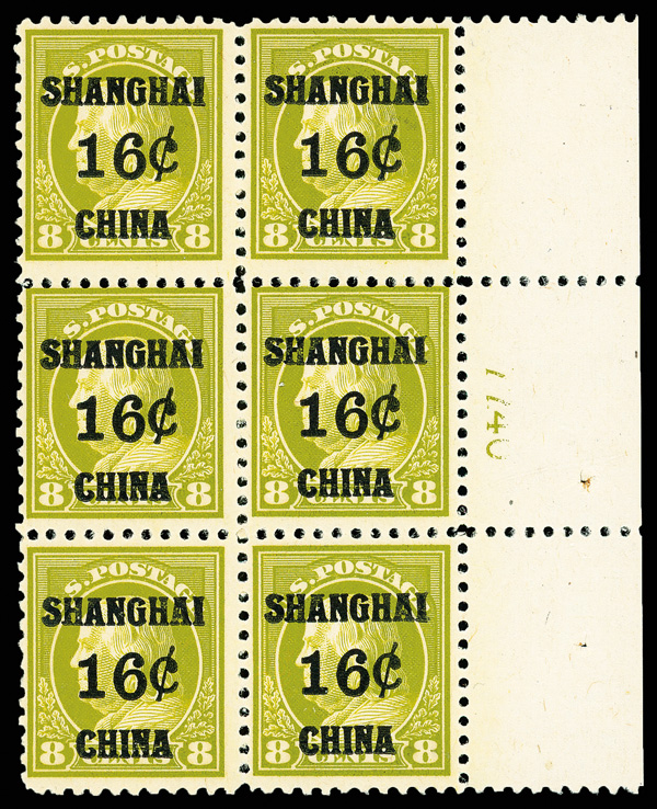 8363 nh/ogbl K8a imageOffices in China, 1919, 16¢ on 8¢ olive green (Scott K8a), right margin plate block of 6 with plate number 7740, Fresh and well-preserved, o.g., top right lightly hinged (5 stamps never hinged), Fine.