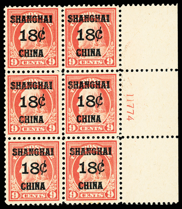 8365 nh/ogbl K9 imageOffices in China, 1919, 18¢ on 9¢ salmon red (Scott K9), right margin plate block of 6 with plate number 11774, Bright, clear presentation, o.g., lightly hinged (4 stamps never hinged), Fine to Very Fine.