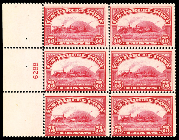 8396 nh/ogbl Q11 imageParcel Post, 1913, 75¢ Harvesting (Scott Q11), left margin plate block of 6 with plate number 6288, Bright, clean, unfaded, o.g., lightly hinged (bottom 2 stamps never hinged), Fine.
