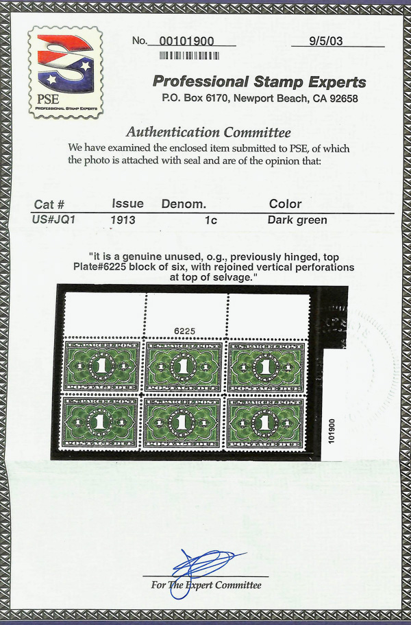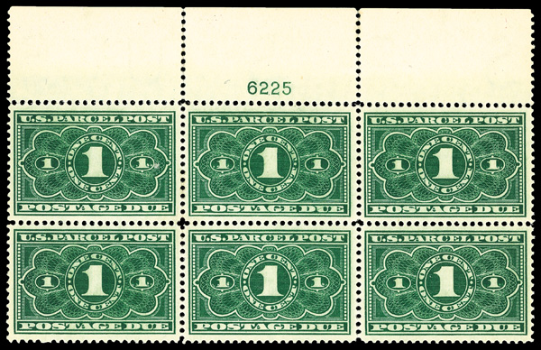 8397 ogbl JQ1 imageParcel Post Postage Due, 1913, 1¢ dark green (Scott JQ1), top margin plate block of 6 with plate number 6225, Fresh and crisply detailed, o.g., previously hinged; rejoined perforations in selvage, Very Fine, with 2003 P.S.E. certificate.