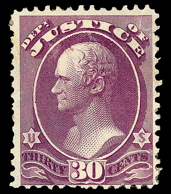 8383 og O33 imageJustice Dept., 1873, 30¢ purple (Scott O33), part o.g. (paper adherence), Very Good to Fine no SMQ price for VG-F 60.