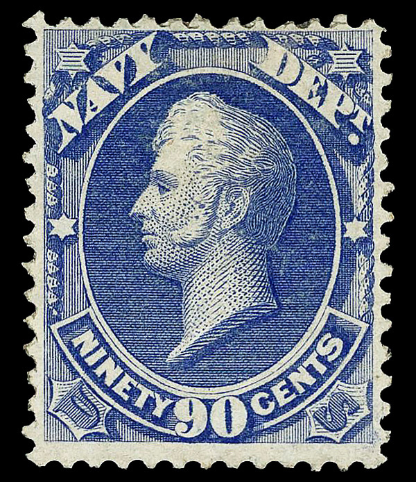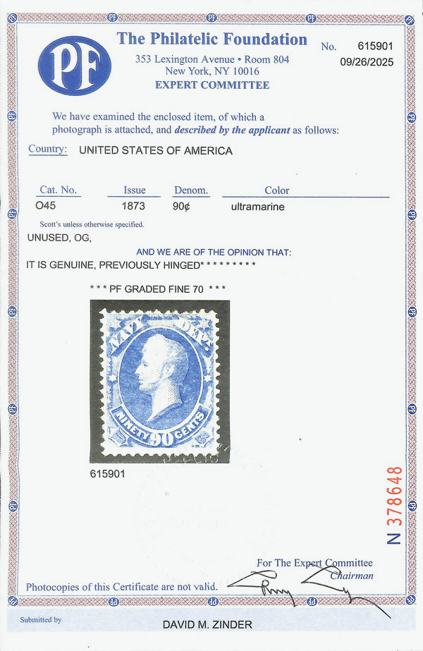 8385 og O45 imageNavy Dept., 1873, 90¢ ultramarine (Scott O45), o.g., hinge remnant, Fine, with 2025 P.F. certificate graded F 70.