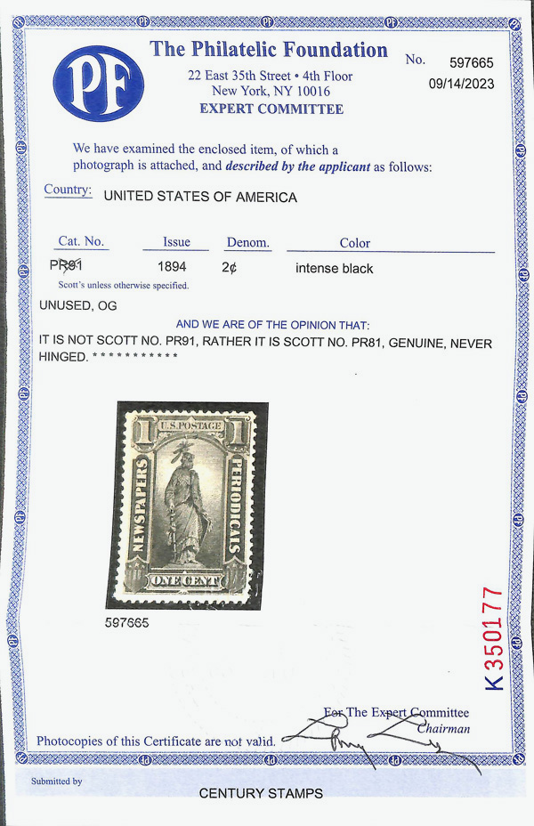 8391 nh PR81 imageNewspaper, 1885, 1¢ black, A.B.N.C. printing (Scott PR81), o.g., never hinged, Fine to Very Fine, with 2023 P.F. certificate.