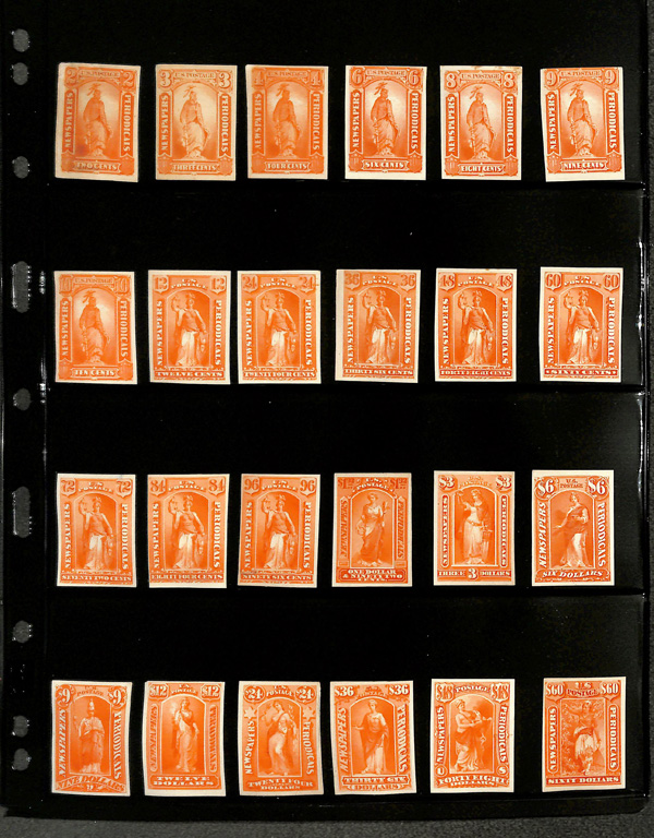 8388 P PR9TC4b-PR32TC32b imageNewspaper, 1875, 2¢-$60 scarlet, "Atlanta" trial color plate proofs on card, complete (Scott PR9TC4b-PR32TC32b), set of 24, o.g., never hinged, Fine to Very Fine.