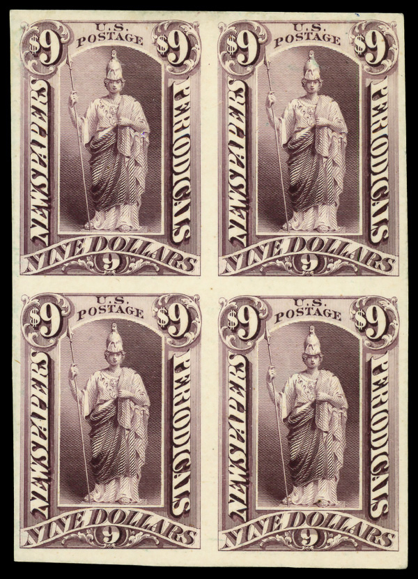 8389 Pbl PR27TC4c imageNewspaper, 1875, $9 brown, "Atlanta" trial color plate proof on card (Scott PR27TC4c), block of 4, o.g., never hinged, Very Fine.
