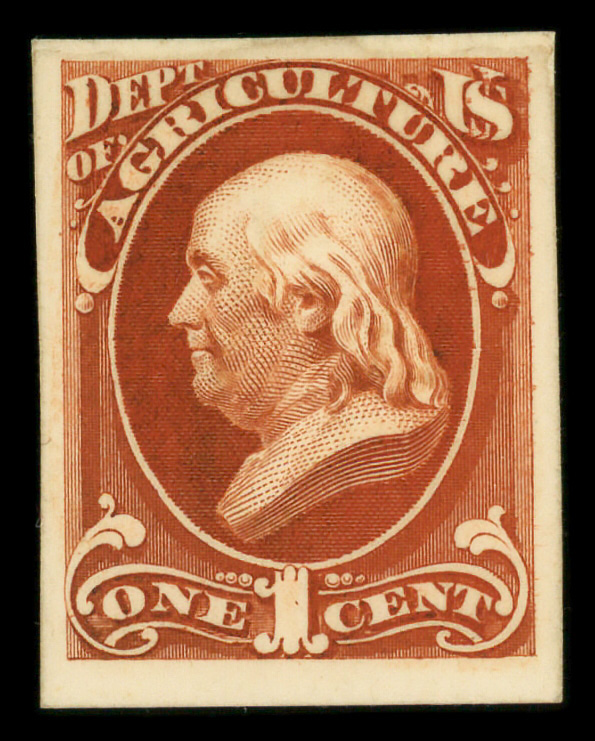 8373 P O1TC4b imageAgriculture Dept., 1873, 1¢ scarlet, "Atlanta" trial color plate proof on card (Scott O1TC4b), o.g., never hinged, Very Fine.