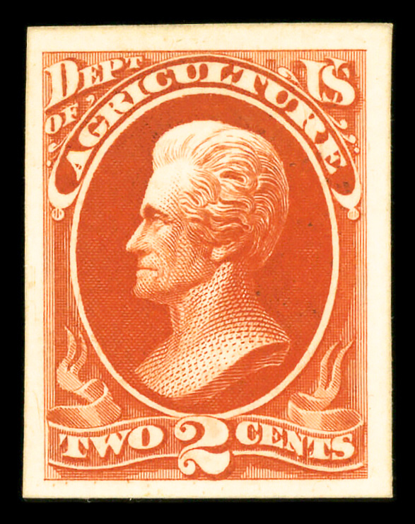 8374 P O2TC4b imageAgriculture Dept., 1873, 2¢ scarlet, "Atlanta" trial color plate proof on card (Scott O2TC4b), o.g., never hinged, Very Fine.