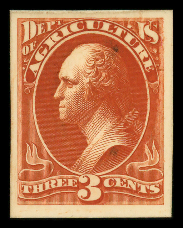 8375 P O3TC4b imageAgriculture Dept., 1873, 3¢ scarlet, "Atlanta" trial color plate proof on card (Scott O3TC4b), o.g., never hinged, Very Fine.