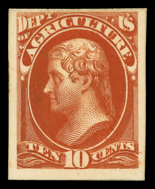 8376 P O5TC4b imageAgriculture Dept., 1873, 10¢ scarlet, "Atlanta" trial color plate proof on card (Scott O5TC4b), o.g., never hinged, Very Fine.