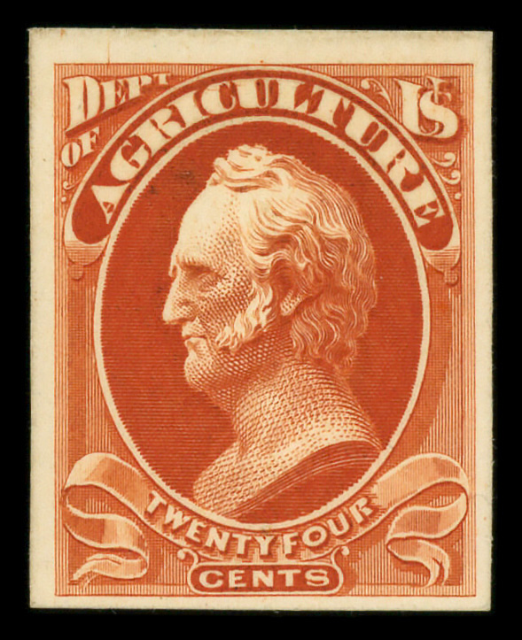 8377 P O8TC4b imageAgriculture Dept., 1873, 24¢ scarlet, "Atlanta" trial color plate proof on card (Scott O8TC4b), o.g., never hinged, Very Fine.