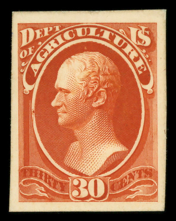 8378 P O9TC4b imageAgriculture Dept., 1873, 30¢ scarlet, "Atlanta" trial color plate proof on card (Scott O9TC4b), o.g., never hinged, Very Fine.