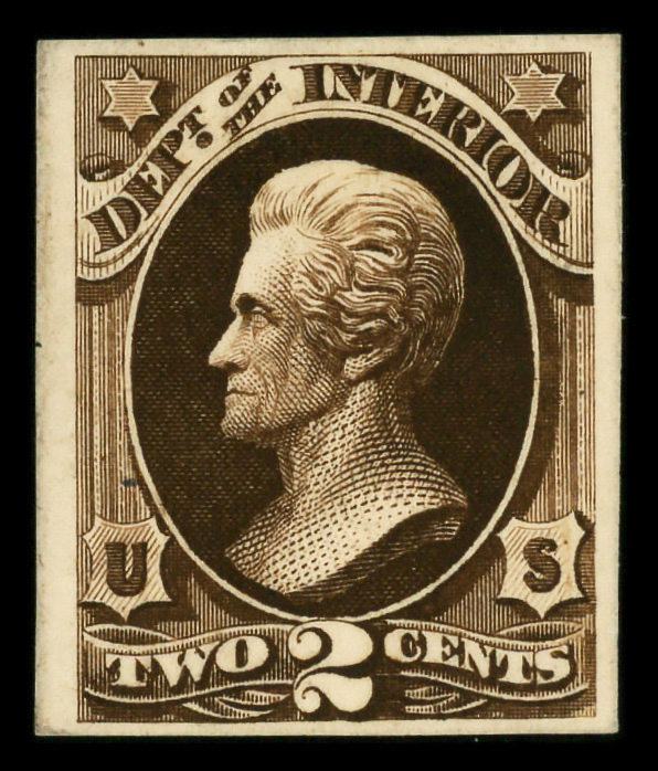 8379 P O16TC4c imageInterior Dept., 1873, 2¢ brown, "Atlanta" trial color plate proof on card (Scott O16TC4c), o.g., never hinged, Very Fine.