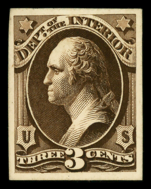8380 P O17TC4c imageInterior Dept., 1873, 3¢ brown, "Atlanta" trial color plate proof on card (Scott O17TC4c), o.g., never hinged, Very Fine.
