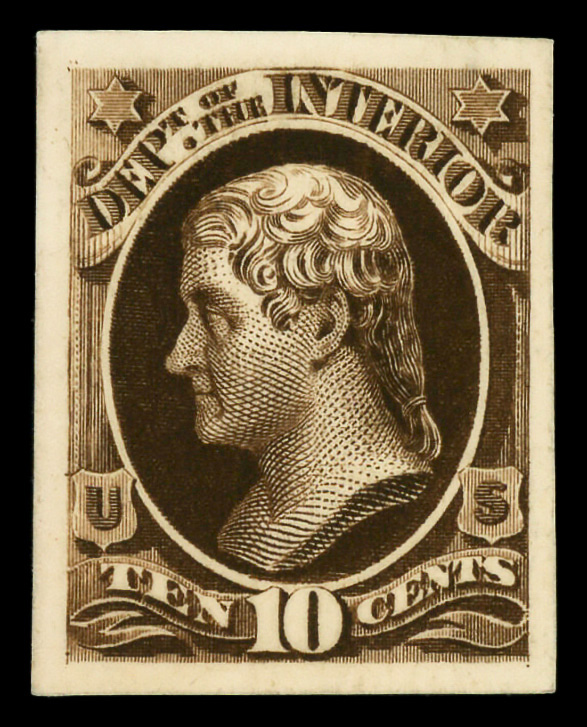 8381 P O19TC4c imageInterior Dept., 1873, 10¢ brown, "Atlanta" trial color plate proof on card (Scott O19TC4c), o.g., never hinged, Very Fine.