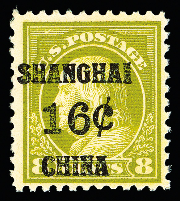 8362 nh K8 imageOffices in China, 1919, 16¢ on 8¢ olive bister (Scott K8), Strikingly bright appearance, o.g., never hinged, Fine to Very Fine.