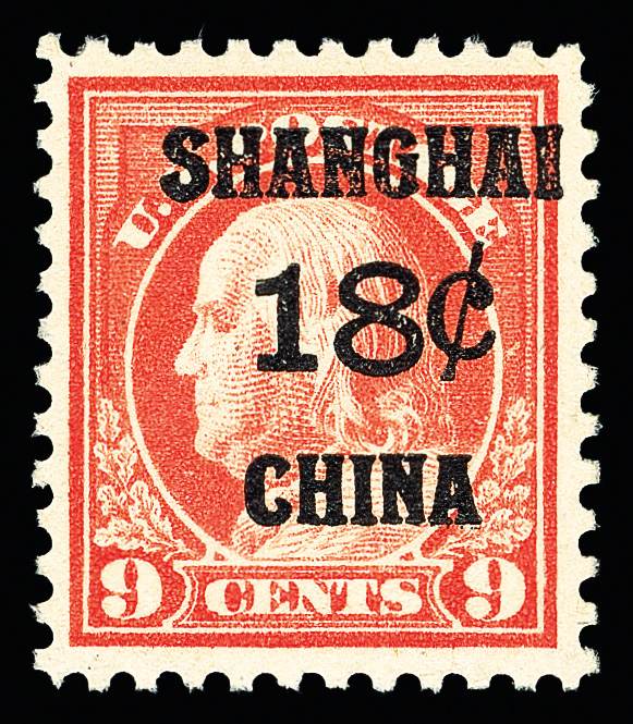 8364 nh K9 imageOffices in China, 1919, 18¢ on 9¢ salmon red (Scott K9), Boldly ink-saturated look, o.g., never hinged, Very Fine to Extremely Fine.