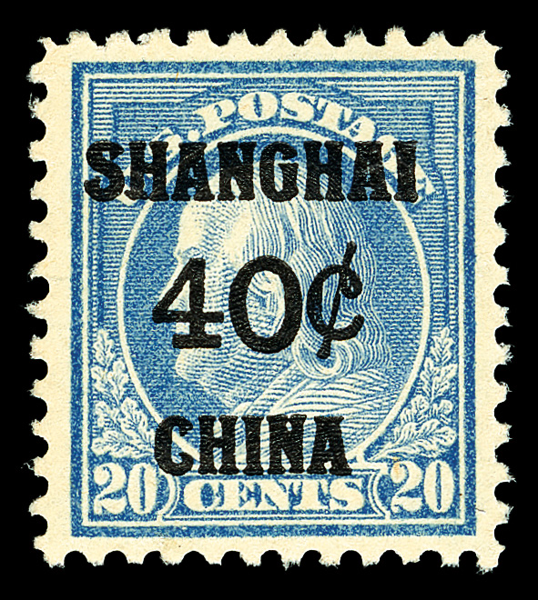 8367 og K13 imageOffices in China, 1919, 40¢ on 20¢ deep ultramarine (Scott K13), Intensely rich hue, o.g., lightly hinged, Very Fine to Extremely Fine.