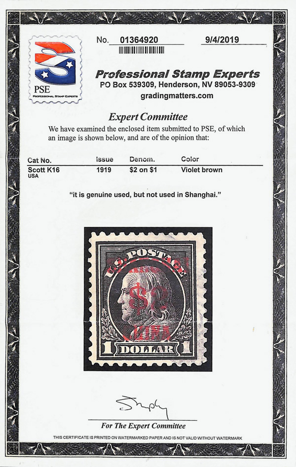 8371 O K16 imageOffices in China, 1919, $2 on $1 violet brown (Scott K16), Wonderfully deep color, used, but not in Shanghai, Fine to Very Fine, with 2019 P.S.E. certificate.