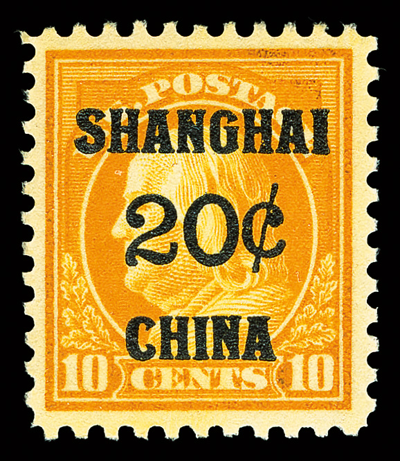8366 nh K10 imageOffices in China, 1919, 20¢ on 10¢ orange yellow (Scott K10), Boldly rendered image, o.g., never hinged, Very Fine to Extremely Fine.
