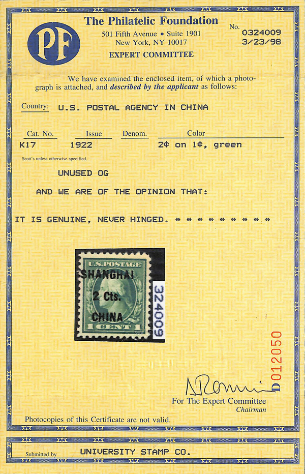 8372 nh K17 imageOffices in China, 1922, 2¢ on 1¢ green (Scott K17), Razor-sharp design detail, o.g., never hinged, Very Fine, with 1998 P.F. certificate.