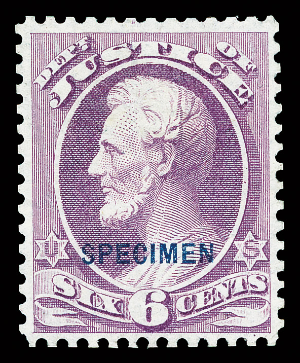 8382 S O28SD imageJustice Dept., 1875 Special Printing, 6¢ purple, overprinted "Specimen" (Scott O28SD), Clean original appearance, without gum as issued; reperforated at left, Very Fine.