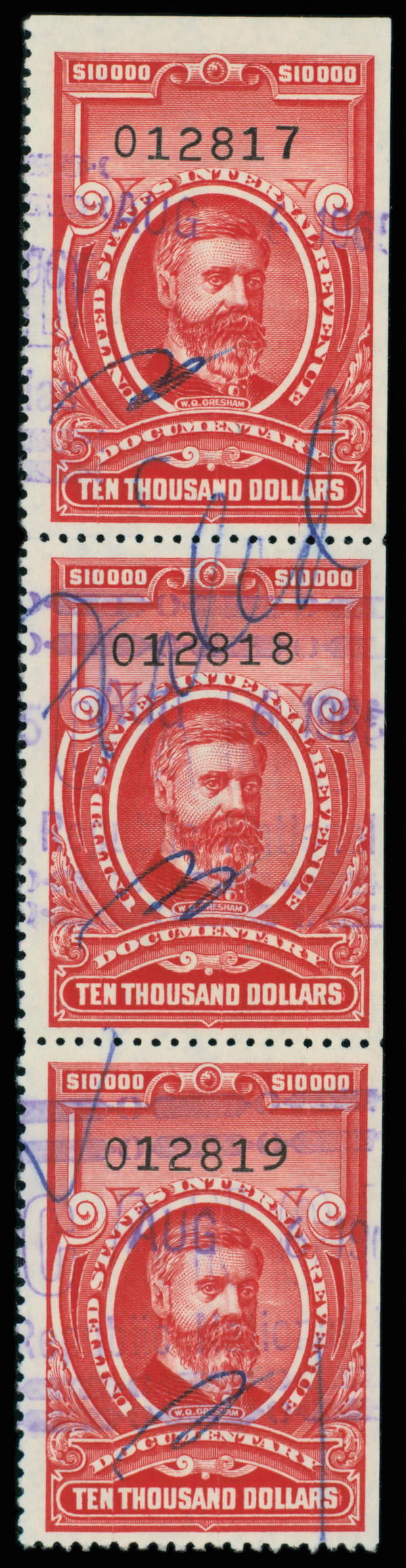 8410 O R732 imageDocumentary, 1958, $10,000 Gresham (Scott R732), strip of 3, cut cancel, Very Fine.