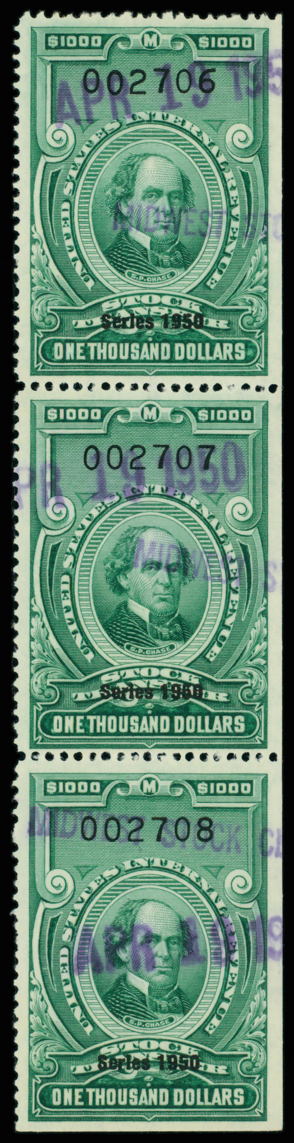 8419 O RD335 imageStock Transfer, 1950, $1,000 Chase (Scott RD335), vertical strip of 3, Fine to Very Fine.